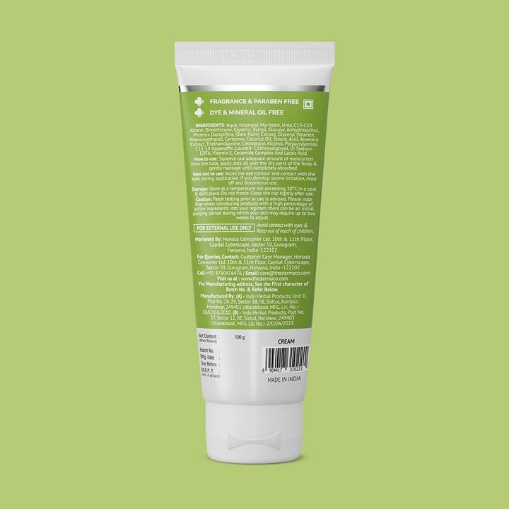Aqua, Isopropyl Myristate, Urea, C15-C19 Alkane, Dimethicone, Glycerin, Xylitol, Glucose, Anhydroxylitol, Phoenix Dactylifera (Date Palm) Extract, Glyceryl Stearate, Phenoxyethanol, Carbomer, Coconut Oil, Stearic Acid, Aloevera Extract, Triethanolamine, Cetostearyl Alcohol, Polyacrylamide, C13-14 Isoparaffin, Laureth-7, Ethoxydiglycol, Di Sodium EDTA, Vitamin E, Ceramide Complex And Lactic Acid