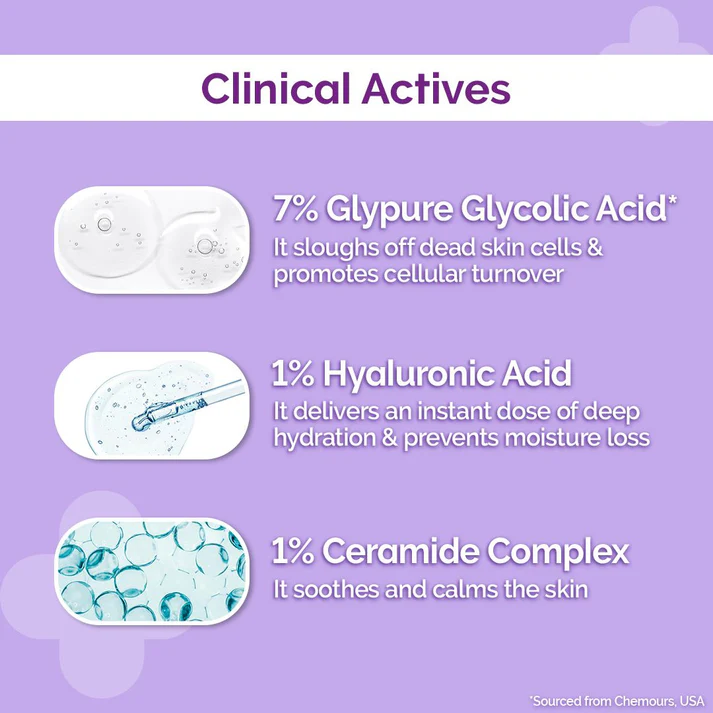 A toner that exfoliates, hydrates, and soothes your skin all at once? Yes, it’s real and it’s here. Introducing 7% Glycolic Acid Hydrating Toner, a multi-tasker that gently sloughs off dead skin cells, deeply hydrates & calms irritated skin. Formulated with 7% Glypure Glycolic Acid, this water-based toner penetrates deep into the skin and promotes cellular turnover, refining the skin’s texture. A powerhouse of hydration, 1% Hyaluronic Acid in this toner prevents moisture loss. Also formulated with 1% Ceramide Complex, the toner repairs & strengthens your skin barrier too. Go ahead, add this to your regime & transform your dull skin to radiant & healthy. Dab and glow!