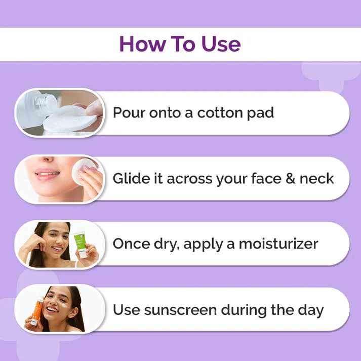 Incorporating The Derma Co 7% Glycolic Acid Hydrating Toner into your daily skincare regimen is simple. First, cleanse your face with a gentle face wash and pat it dry. Next, take an adequate amount of glycolic acid toner on your palm or a cotton pad and gently wipe your face and neck. Follow up with a hydrating face serum and face moisturizer for best results. Lastly, use an SPF or sunscreen before stepping out under the harmful UV rays.